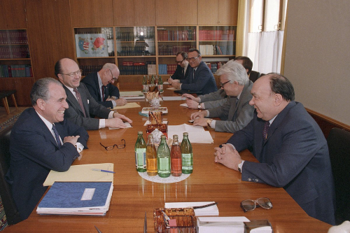 Встреча Александра Яковлева (справа) с директором информационного агентства США (USIA) Чарльзом Уиком (слева)
