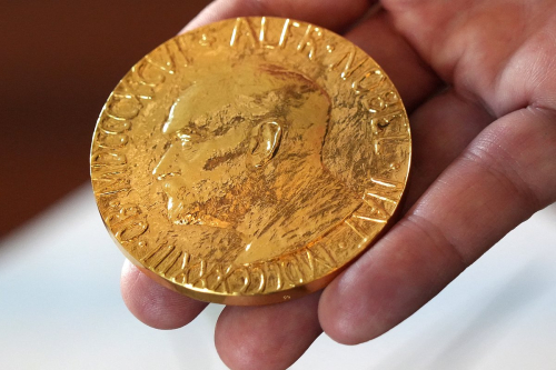 Сотрудник Норвежского Нобелевского института держит точную копию Нобелевской медали мира в Институте в Осло