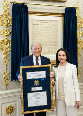 Лидер венесуэльской оппозиции вручила американскому главе медаль Нобелевской премии мира во время их встречи в Белом доме. До этого она также поддержала удары Трампа по Венесуэле, заявляя, что считает его «защитником свободы в этом полушарии». Трамп отмечает, что заслуженно получил эту награду за проделанную работу.