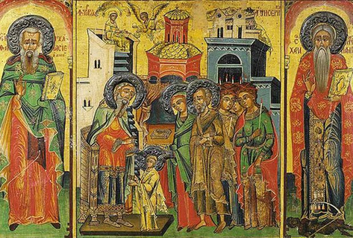 «Святитель Григорий Палама в своем слове «На Введение во храм Пресвятой Богородицы» объясняет сакральный смысл этого события, — продолжает Сергей Козловский. — Он называет Марию, помещенную в святая святых, «сокровищем Божьим», говоря, что она стала Новым Ковчегом вместо утраченного, Ковчегом, в котором вскоре должен появиться носитель скрижалей Нового Завета — Завета Иисуса Христа. Символично, что Введение во храм Богородицы предваряет Рождество Христово».